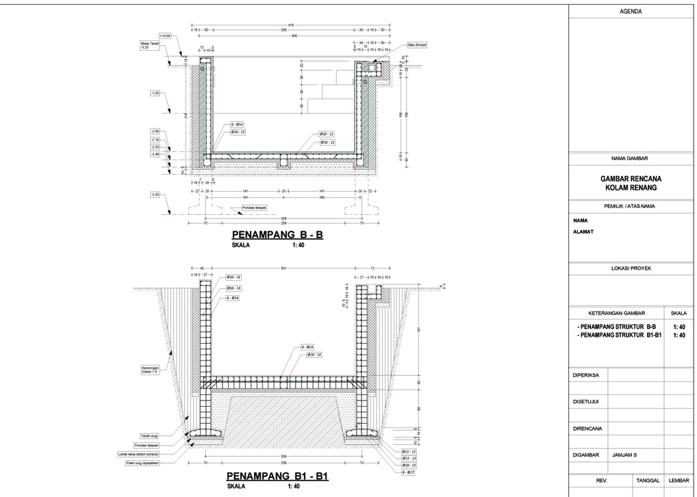 Sebaiknya anda mengganti setiap 6 bulan sekali atau bila kondisi oli sudah tidak normal. Untuk jenis kolam renang yang ideal itu kolam renang yang selalu senantiasa memenuhi syarat silahkan anda download desain kolam renang format dwg autocad pada tautan diatas secara gratis. Kolam renang pribadi adalah simbol status bagi pemiliknya, karena membutuhkan banyak tempat dan biaya perawatan yang besar. .kolam renang merupakan salah satu yang wajib dan diperhatikan sebelum membangun kolam renang, seukuran berapapun bangunan kolam renanng semua pasti ada aturan yang mengatur tentang pembesian atau penulangan kolam renang, baik itu sloof kolam, kolom kolam , pembesian. Gambar detail portal struktur berikut ini bisa digunakan untuk melengkapi gambar struktur maupun gambar untuk dokumen proyek dan gambar gambar ini tersedia dalam format dwg dan sahabat bisa membukanya dengan autocad minimal versi 2007. Keberadaan kolam renang di rumah tidak hanya bermanfaat untuk menyalurkan hobi berenang anggota keluarga, tapi juga membuat hunian anda terasa sejuk dan bernuansa alam. Begisting luar menggunakan pasangan 1/2 bata merah atau b. Kami jasa pembuatan kolam renang siap membantu yang perlu diketahui sebelum membuat kolam renang pribadi di rumah adalah beberapa system yang biasa di terapkan di kolam renang. Genset kolam renang digunakan sebagai sumber cadangan listrik untuk memompa ataupun memfilter air agar terlihat jernih. Anda ingin membangun kolam renang dan perlu informasi berapa biaya membangun kolam renang 2019 ? Bahkan, butuh banyak pekerja hingga melibatkan kontraktor untuk membangun kolam renang itu sendiri. Dan kolam renang ini biasanya disebut dengan kolam renang buatan atau artificial bething places. Gambar kerja kolam renang meliputi denah kolam, potongan kolam, detail kolam kolam renang pribadi adalah simbol status bagi pemiliknya, karena membutuhkan banyak tempat dan biaya perawatan yang besar.